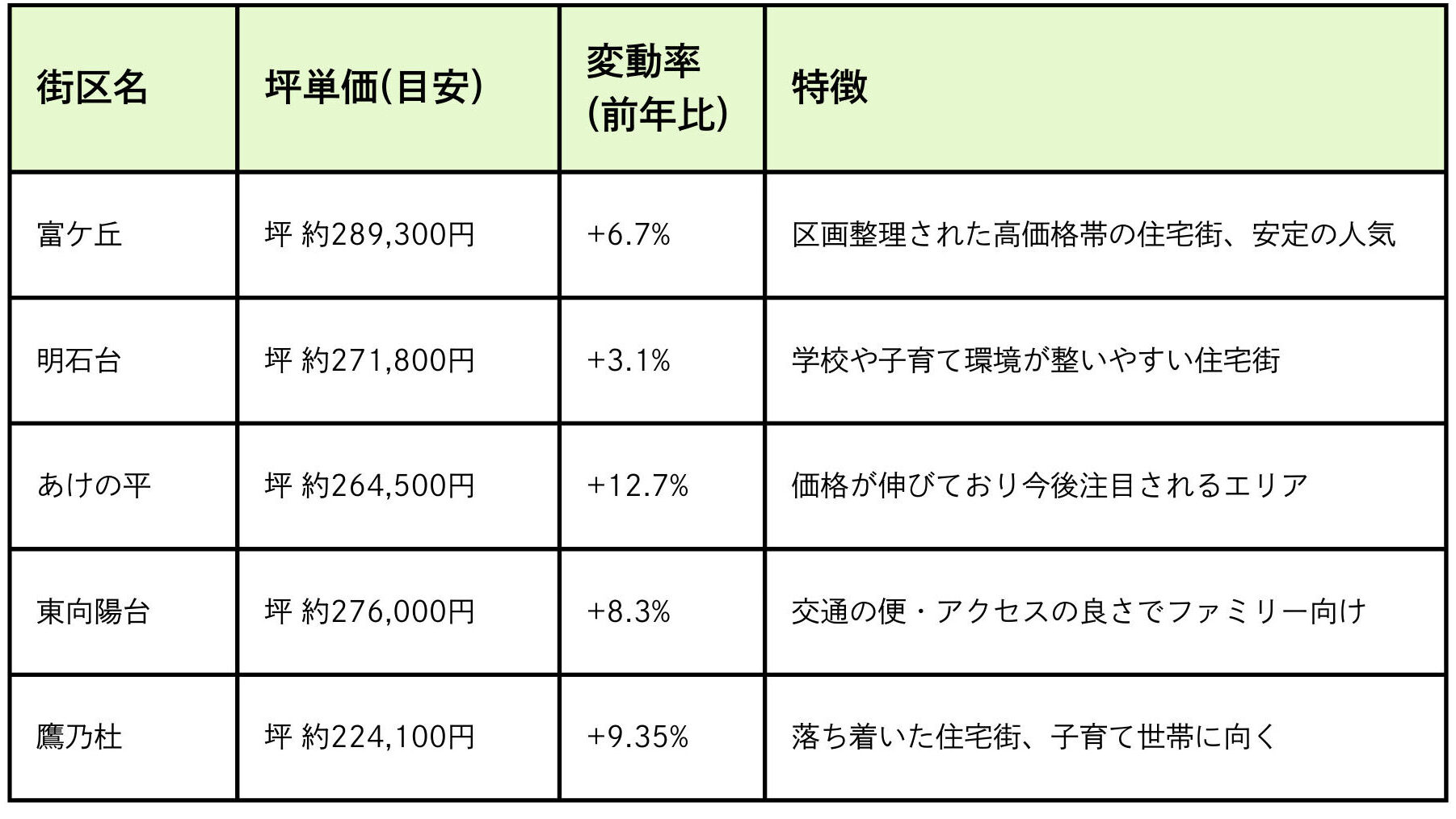 - エリアで地価の差が大きく、立地条件によって売れやすさ・価格にバラつきがある